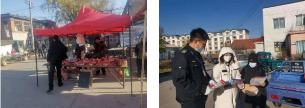 检查中,执法人员深入开山屯镇农贸市场,重点查验动物产品检疫证明持证情况、胴体检疫验讫章、冷冻动物产品包装检疫标识等方面。针对检查中发现的问题,第一时间责令摊主改正,坚决杜绝病害肉和不合格的畜产品上市销售。同时,还向市场摊主和当地群众进行了普法宣传,通过现场讲解、发放宣传单及悬挂宣传条幅等方式,进一步提高群众的法律意识,帮助群众懂法、守法,学会使用法律来维护正当权益。