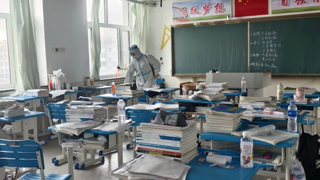 有一种担当,叫“汗水浸透的守护”。2025年11月16日,为了给莘莘学子筑起一道健康屏障,队员们身穿密不透风的防护服,肩背沉重的消杀设备,走进龙井高级中学。从教室的桌椅到门把手的缝隙,从走廊的扶手到食堂的每一个角落,他们用脚步一寸一寸地丈量校园的安全。护目镜被雾气模糊,衣衫被汗水湿透,数小时的连续奋战,换来了校园的安全和师生的安心。那一道道穿梭在教学楼间的蓝色身影,是对无私奉献最朴素、最有力的诠释。