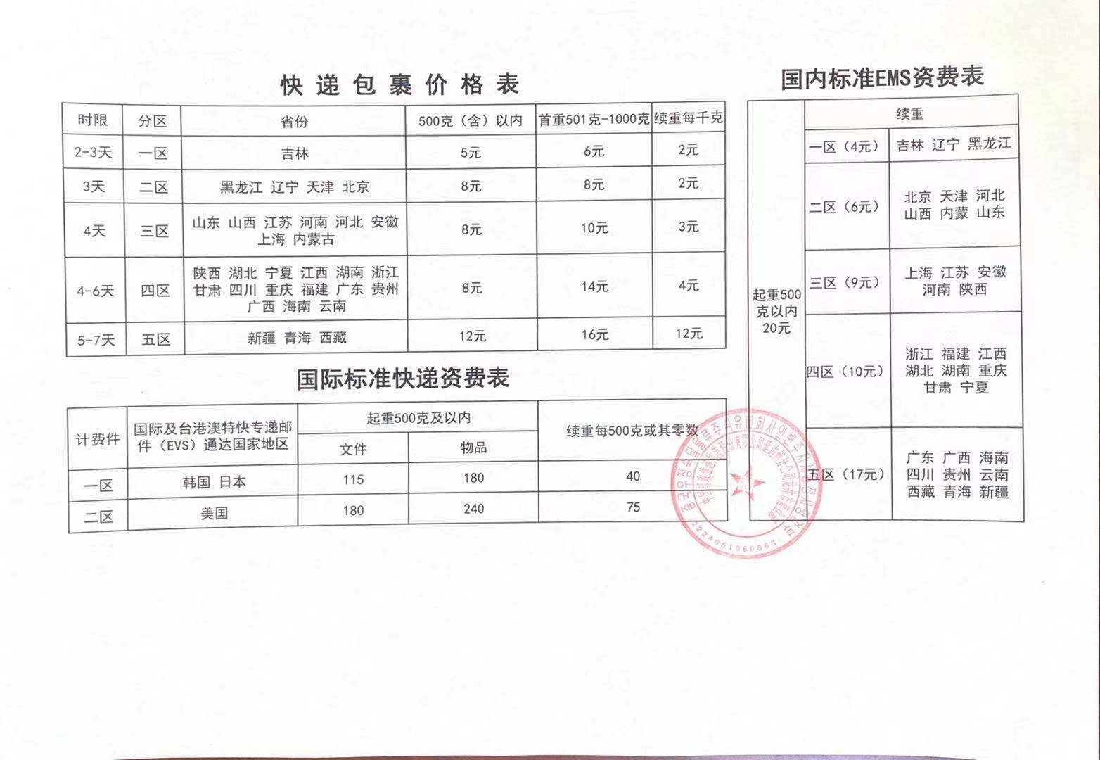 附件:中国邮政集团有限公司吉林省龙井市分公司2020年快递包裹资费标准