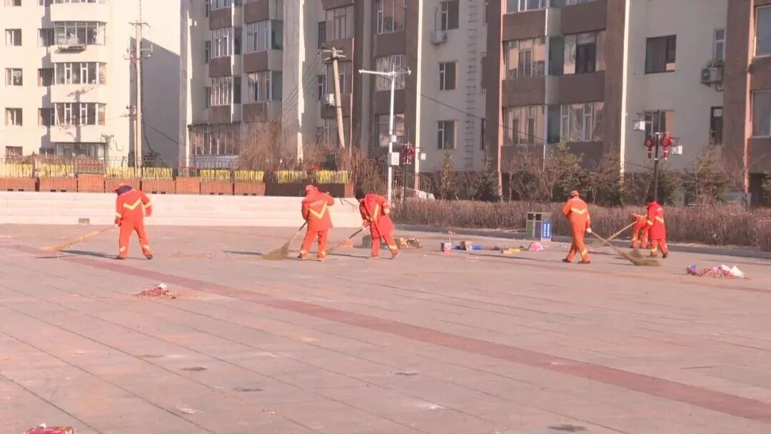 住宅小区出入口、城市广场上,身着橙色工装的环卫工人身影格外醒目。红色的鞭炮纸屑铺满路面,他们三人成组、五人一队,手持大扫帚弯腰清扫、聚拢成堆,动作娴熟而利落。据了解,今年春节期间,该公司启动一级应急预案,200余名一线环卫工作者全员在岗值守,对重点路段实行“扫、收、运”流水线作业,有效避免鞭炮纸屑被风吹散造成二次污染,用坚守换来了城市的洁净与有序。
